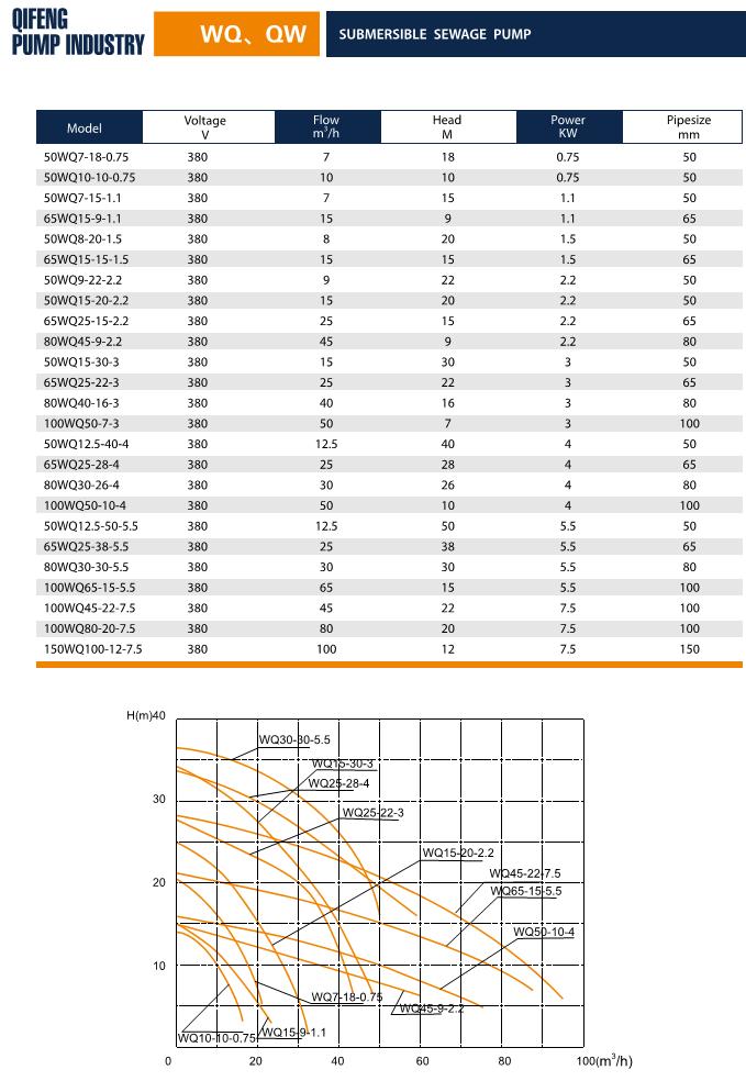 * Chi tiết kỹ thuật Máy bơm nước thải Qifeng 100WQ65-15-5.5